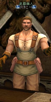 商業都市ギラン城の村の武器屋のおっちゃん。 この村はとっても大きいから、武器屋、防具屋、それにアクセサリー屋さんがそれぞればらばらに設置されてるの。 さらにその他に名品館まであって、村の中で買い物をするだけでも右往左往よ。